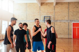 Two basketball players high fiving after winning match.