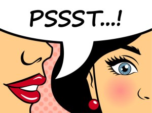 Retro woman whispering gossip to the friend. Pop art style female character telling secret with speech bubble. Flat vector illustration