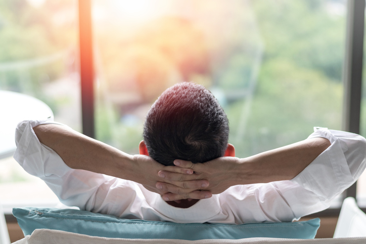 Good life and easy relax business man lifestyle after work from home sitting hands behind head for happy businessmen people. Work life balance concept.