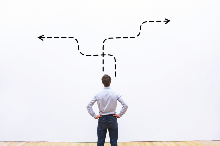 business strategy or decision making concept business strategy or decision making concept, pensive businessman choosing direction