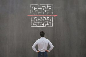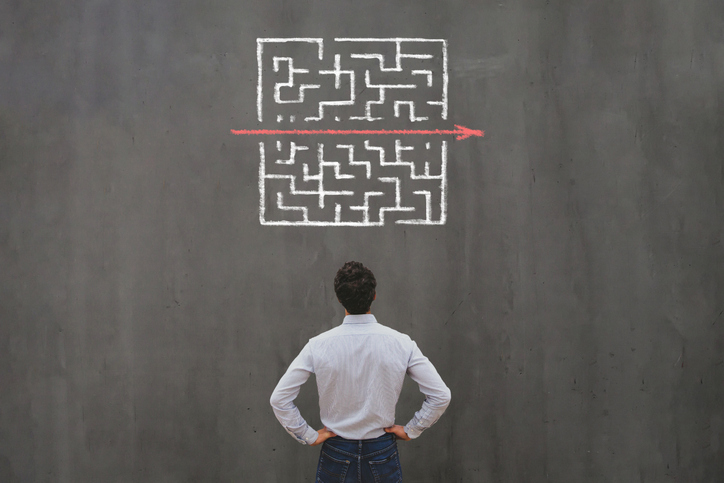 simple easy fast solution concept simple easy fast solution concept, problem solving, business man thinking about exit from complex labyrinth maze