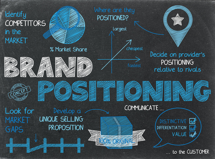 BRAND POSITIONING concept on blackboard BRAND POSITIONING colorful concept sketch notes on blackboard background