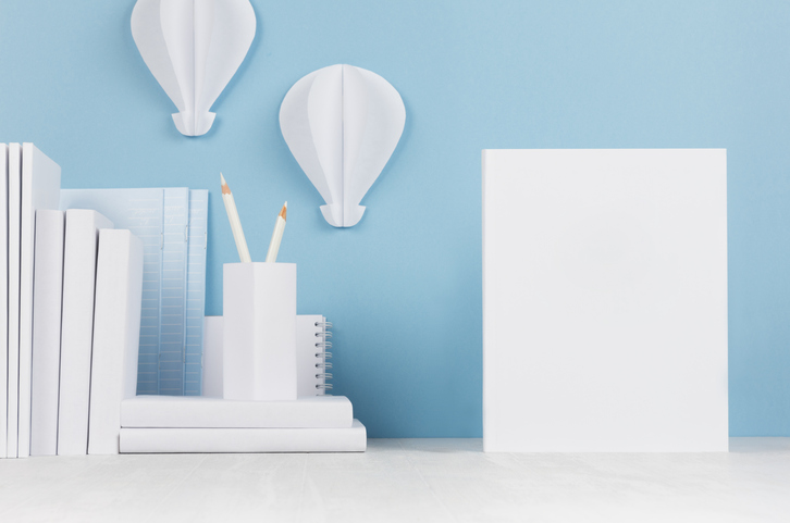 School template – white books, stationery, blank paper and decorative ballons origami on white desk and soft blue background. Back to school background with copy space.