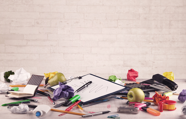 Office desk closeup with white brick wall Close up of business office desk with pen board coffee in front of empty white brick textured wall background.
