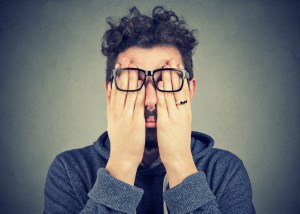 young man in glasses covering face eyes with both hands Closeup portrait young man in glasses covering face eyes with both hands isolated on gray wall background