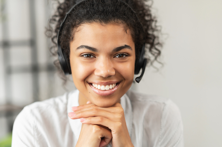 Headshot of friendly African American millennial woman in a headset sitting with her hands on a chin, working in the customer service department as call center operator, helping client with inquiry