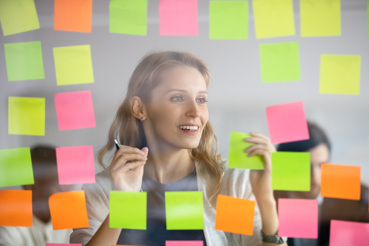 View from window smiling motivated young caucasian female blonde employee managing project issues using paper stickers, adding notes on glass wall, organizing effective workflow, checking tasks.