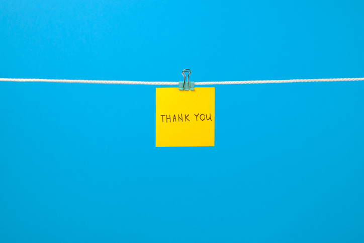 Yellow paper note on clothesline with text Thank You over colorful background Yellow paper note on clothesline with text Thank You over colorful background
