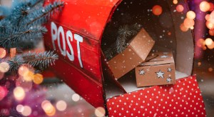 red Christmas mailbox with gift boxes and a greeting card from Santa Claus. Christmas lights bokeh. Holiday delivery. Close-up.