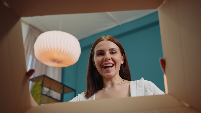 Happy surprised winner girl unpacking delivery parcel sitting at home. Smiling satisfied young woman shopper, online shop customer opening cardboard box receiving purchase gift by fast postal shipping