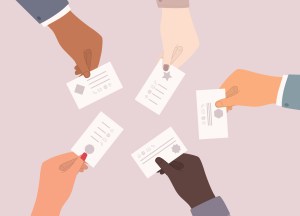Diverse Group Of Business Person’s Hand Exchanging Name Card. Diverse Group Of Male And Female Business Person’s Hand Exchanging Name Card. Isolated On Color Background.