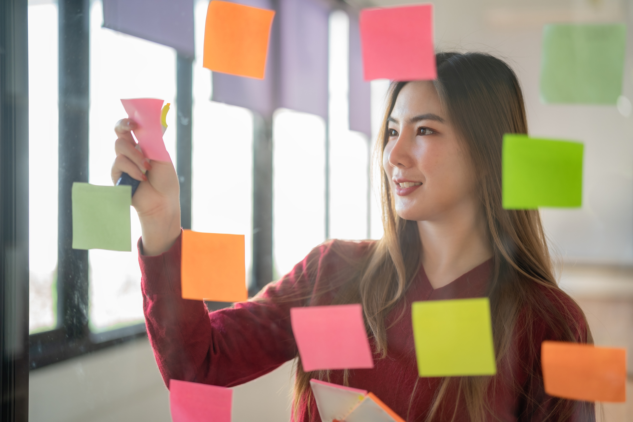 Asian businesswomen use post-it notes on glass walls to write strategic business plans for development to grow to success. Asian businesswomen use post-it notes on glass walls to write strategic business plans for development to grow to success.