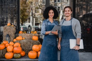 Happy young coffee shop owners standing outdoor near their cafe with laptop and decorating pumpkins preparing for halloween on background.