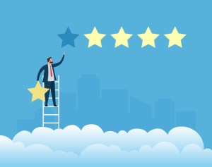 Businessmen giving five stars rating. Reputation and quality concept. Businessmen giving five stars rating. Reputation and quality concept. Flat vector illustration.